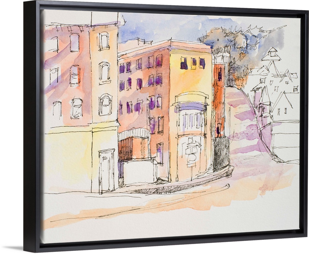 <p>Watercolor and ink painting of a street corner.</p>