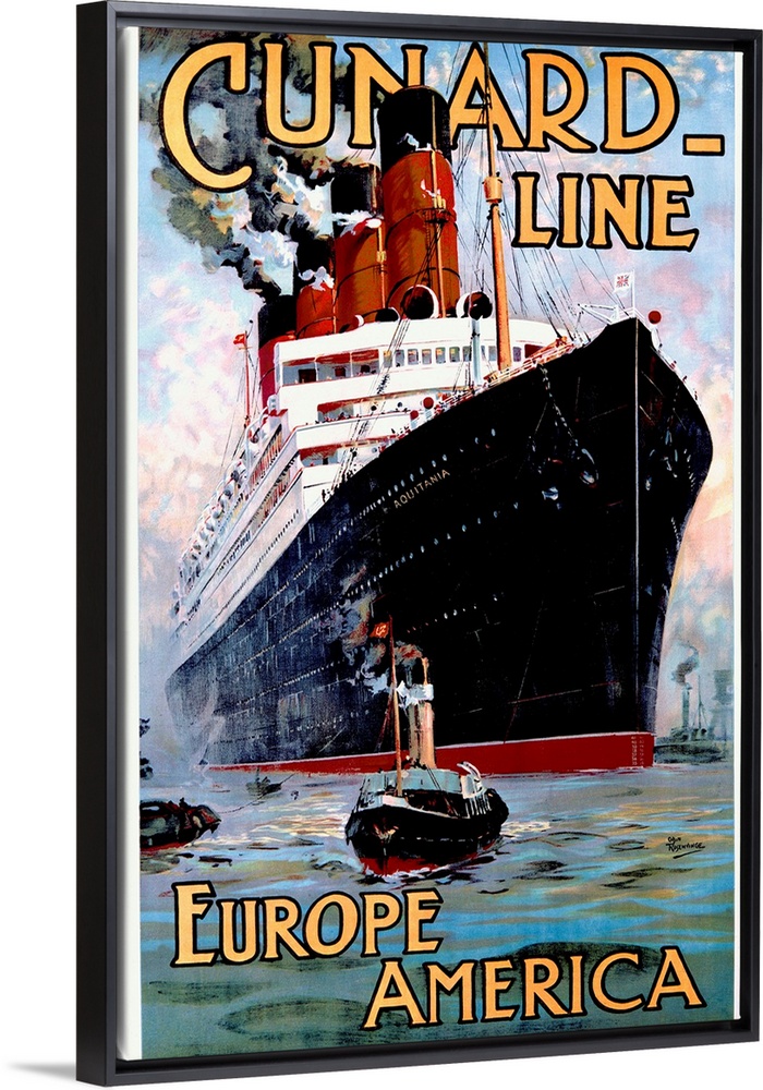 <p>Vintage poster of an immense passenger ship that is being pulled by a small tug boat at the bottom of the painting.</p>