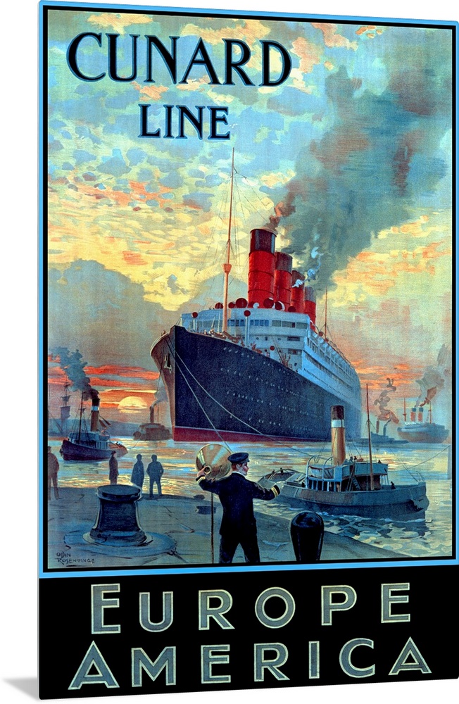 <p>Advertising poster promoting travel by large ship across the Atlantic ocean. The ship arrives at the dock in the morning as smaller tugboats clear the way.</p>