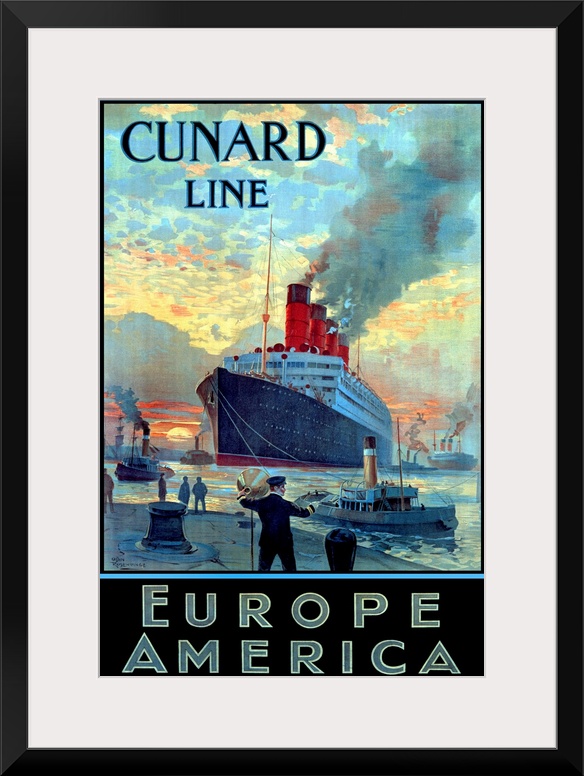 <p>Advertising poster promoting travel by large ship across the Atlantic ocean. The ship arrives at the dock in the morning as smaller tugboats clear the way.</p>