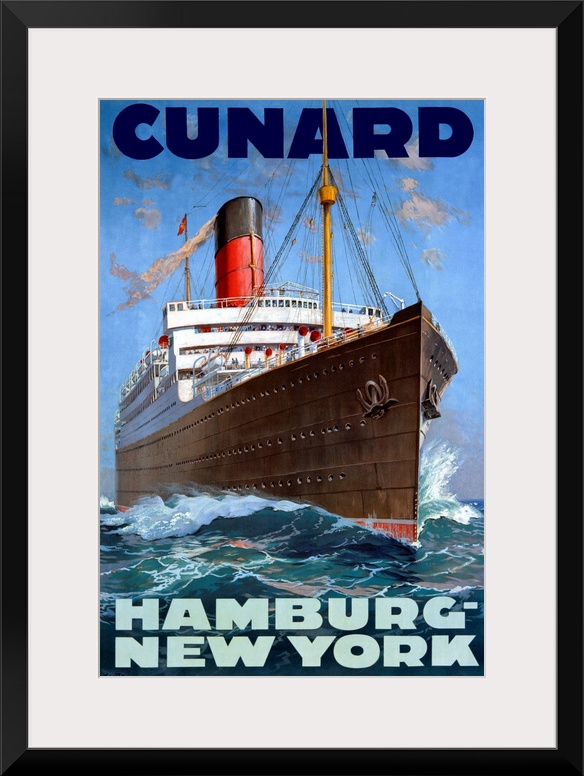 <p>Large, vertical vintage advertisement for the Cunard Line, from Hamburg to New York. A large ship charges through the water, beneath a blue sky.</p>