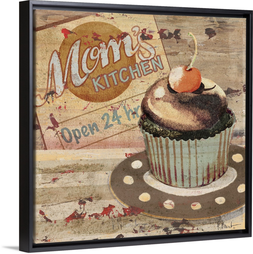 <p>Rustic sign for a bakery featuring a cupcake and the text Mom's Kitchen.</p>