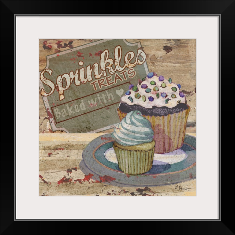 <p>Rustic sign for a bakery featuring a cupcake and the text Sprinkles Treats.</p>
