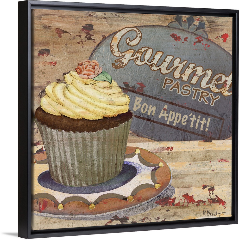 <p>Rustic sign for a bakery featuring a cupcake and the text Gourmet Pastry.</p>