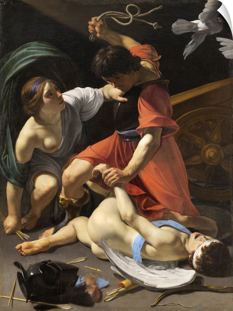 <p>Following the example of the revolutionary early seventeenth-century artist Michelangelo Merisi da Caravaggio, Bartolomeo Manfredi chose to depict ordinary individuals in his scenes from the Bible and Greek and Roman mythology. Caravaggio had demonstrated to Manfredi and an entire generation of European artists that such lofty themes could be transformed into events experienced by ordinary people. Employing dramatic lighting and locating the action directly before the viewer, these artists were able to endow their narratives with great immediacy and power. Cupid Chastised depicts a moment of high drama: Mars, the god of war, beats Cupid for having caused his affair with Venus, the goddess of love, which exposed him to the derision and outrage of the other gods. Venus implores him in vain to desist. Surrounded by darkness, the three figures are boldly illuminated from the left, intensifying the dynamism and impact of the composition. The sheer physicality of the figures - the crouching Venus, whose broadly realized face strays from the classical ideal; the powerful Mars, whose musculature and brilliant red drapery seem to pulsate with fury; and Cupid, whose naked flesh and recumbent position render him particularly vulnerable - conveys the violent discord of the scene. On one level a tale of domestic disturbance, the story also symbolizes the eternal conflict between love and war.</p>