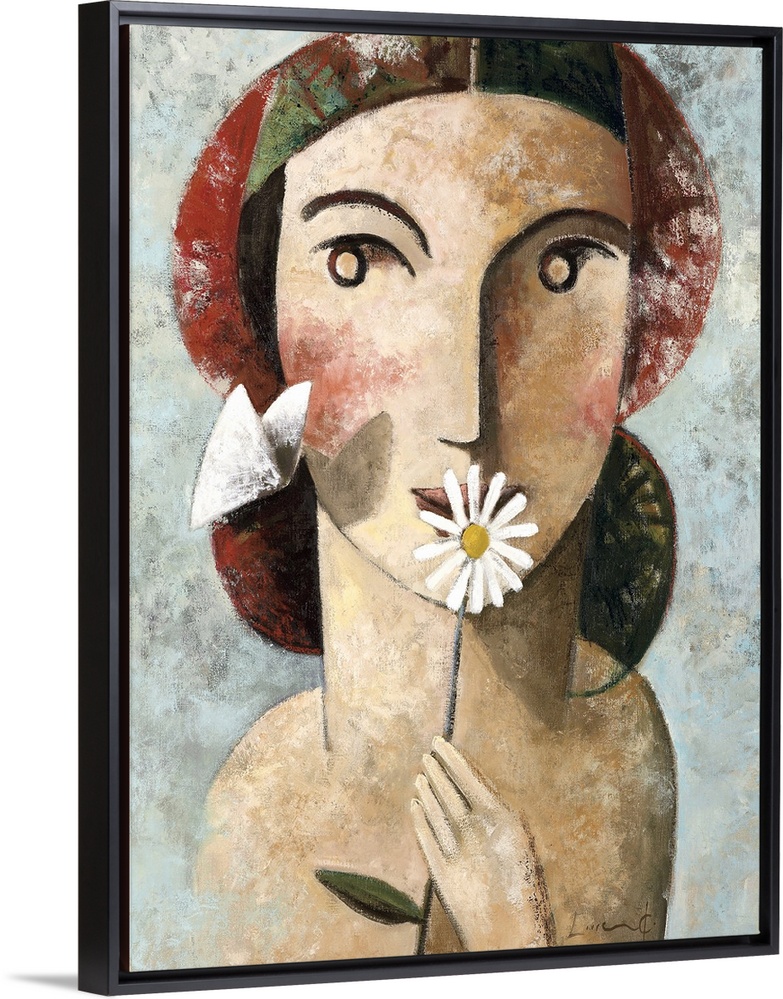 <p>A vertical portrait of a woman holding a daisy while a white butterfly passes by, painted in a cubism style.</p>