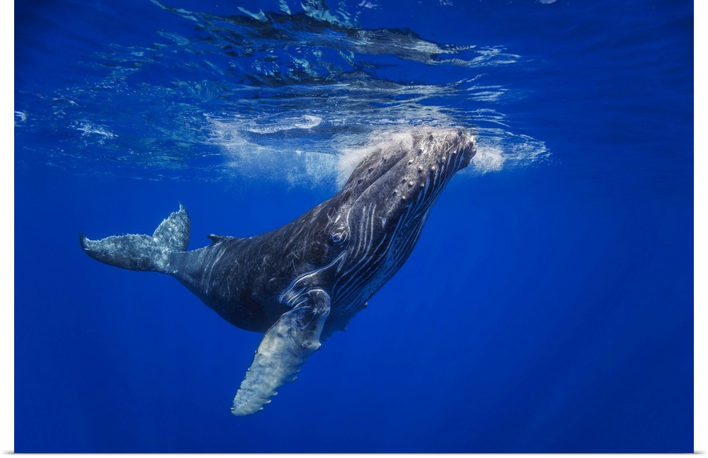 <p>Curious young humpback whale (megaptera novaeangliae) underwater, Hawaii, united states of America.</p>