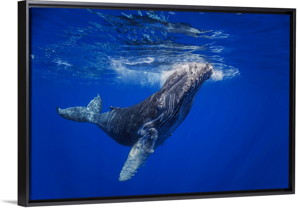 <p>Curious young humpback whale (megaptera novaeangliae) underwater, Hawaii, united states of America.</p>
