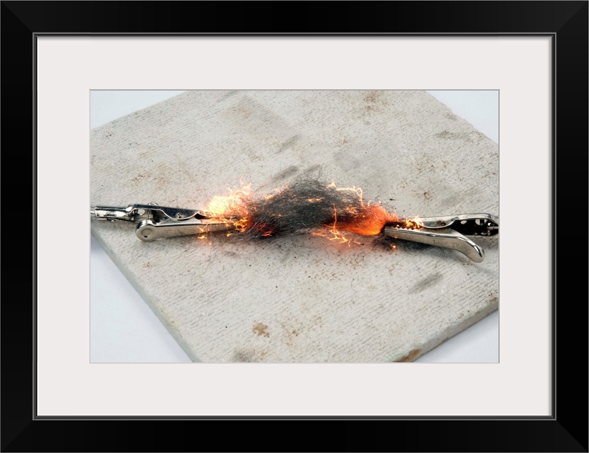 <p>Current melting steel wool. Steel wool attached between two pieces of wire through which a current is being passed. The current is heating up the wool and causing it to melt.</p>