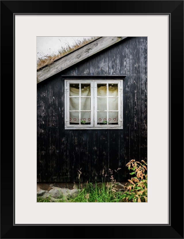 <p>A window with white frames in the black wall of a house.</p>