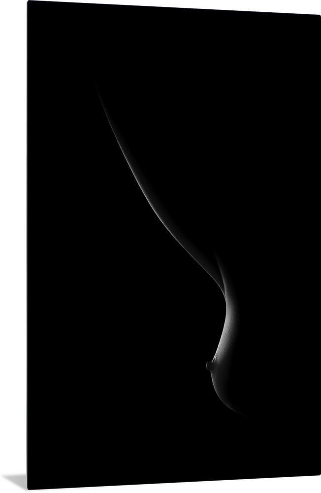 <p>Black and white image of light on a woman's breast creating soft curving lines.</p>