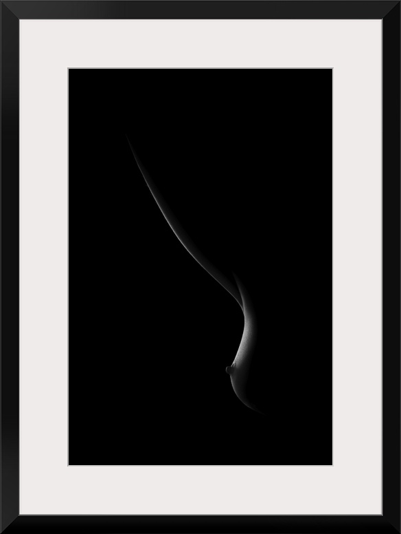<p>Black and white image of light on a woman's breast creating soft curving lines.</p>