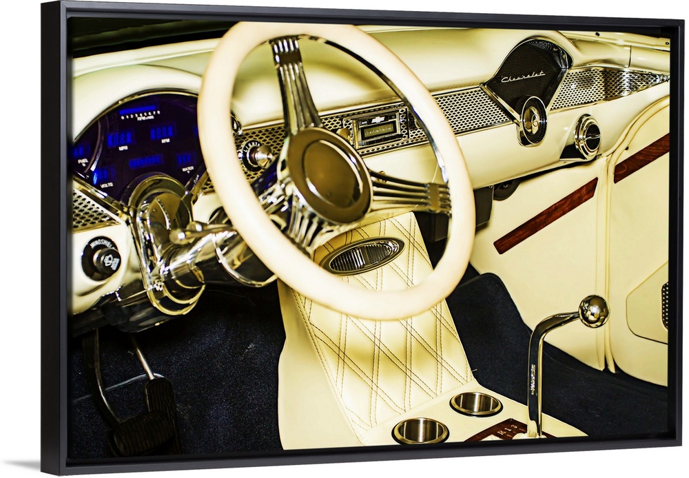 <p>Fine art photograph of the white leather dashboard and console of a vintage car.</p>
