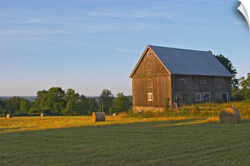 <p>Cut field with hay bales at sunrise. Old farm house barn. Traditional style Swedish wooden painted house. Barn Smaland region. Sweden, Europe.</p>