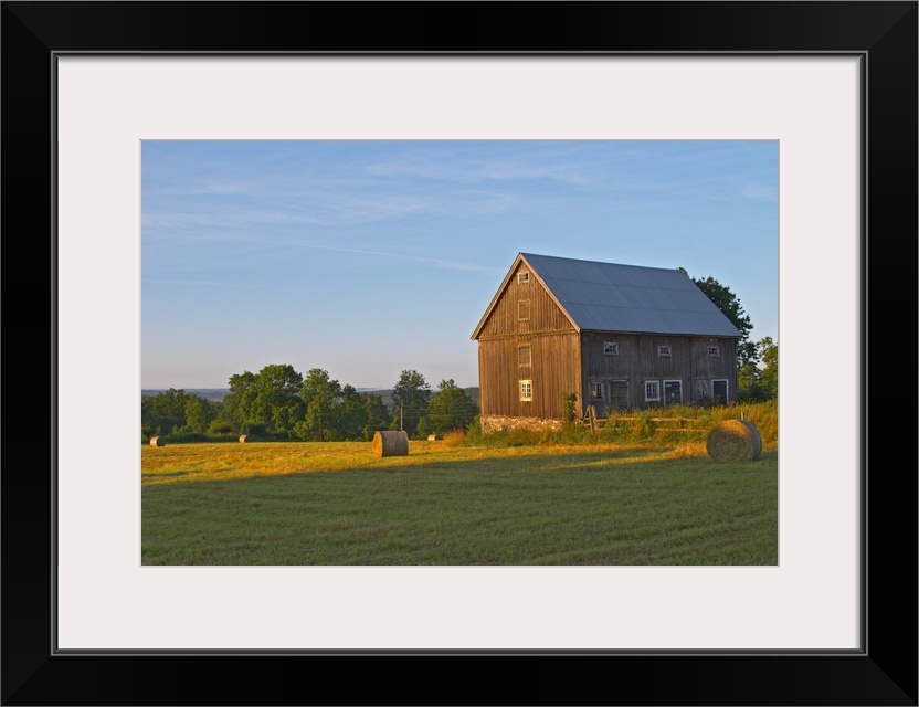 <p>Cut field with hay bales at sunrise. Old farm house barn. Traditional style Swedish wooden painted house. Barn Smaland region. Sweden, Europe.</p>