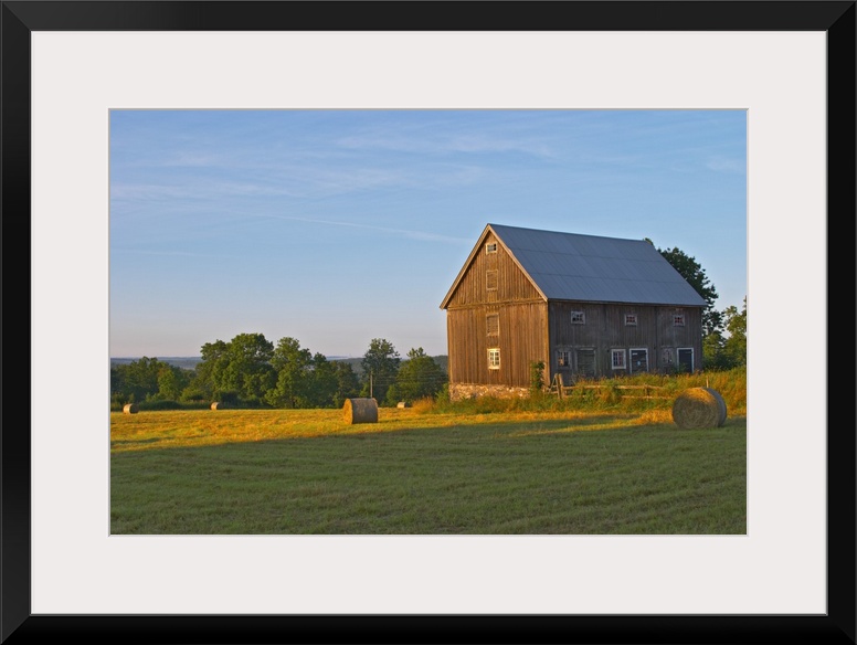 <p>Cut field with hay bales at sunrise. Old farm house barn. Traditional style Swedish wooden painted house. Barn Smaland region. Sweden, Europe.</p>