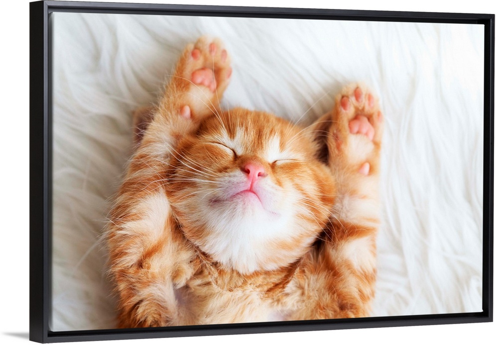 <p>Cute little red kitten sleeps on white fur blanket.</p>