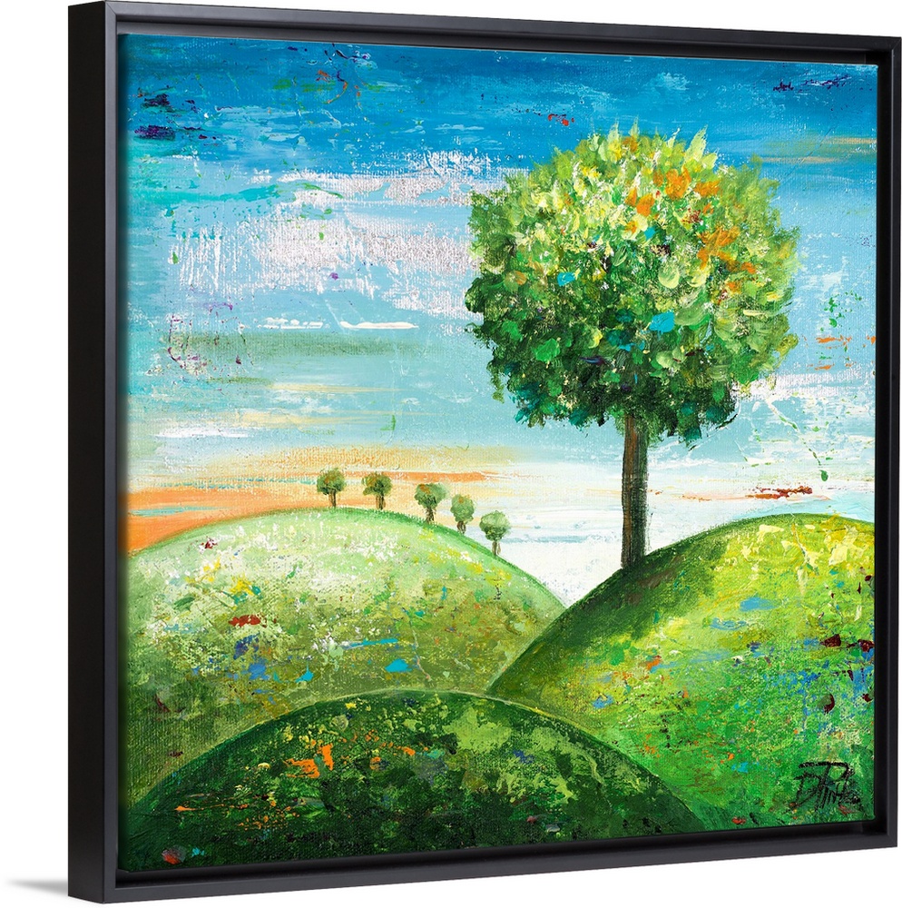 <p>Contemporary painting of a round tree on a green hillside.</p>