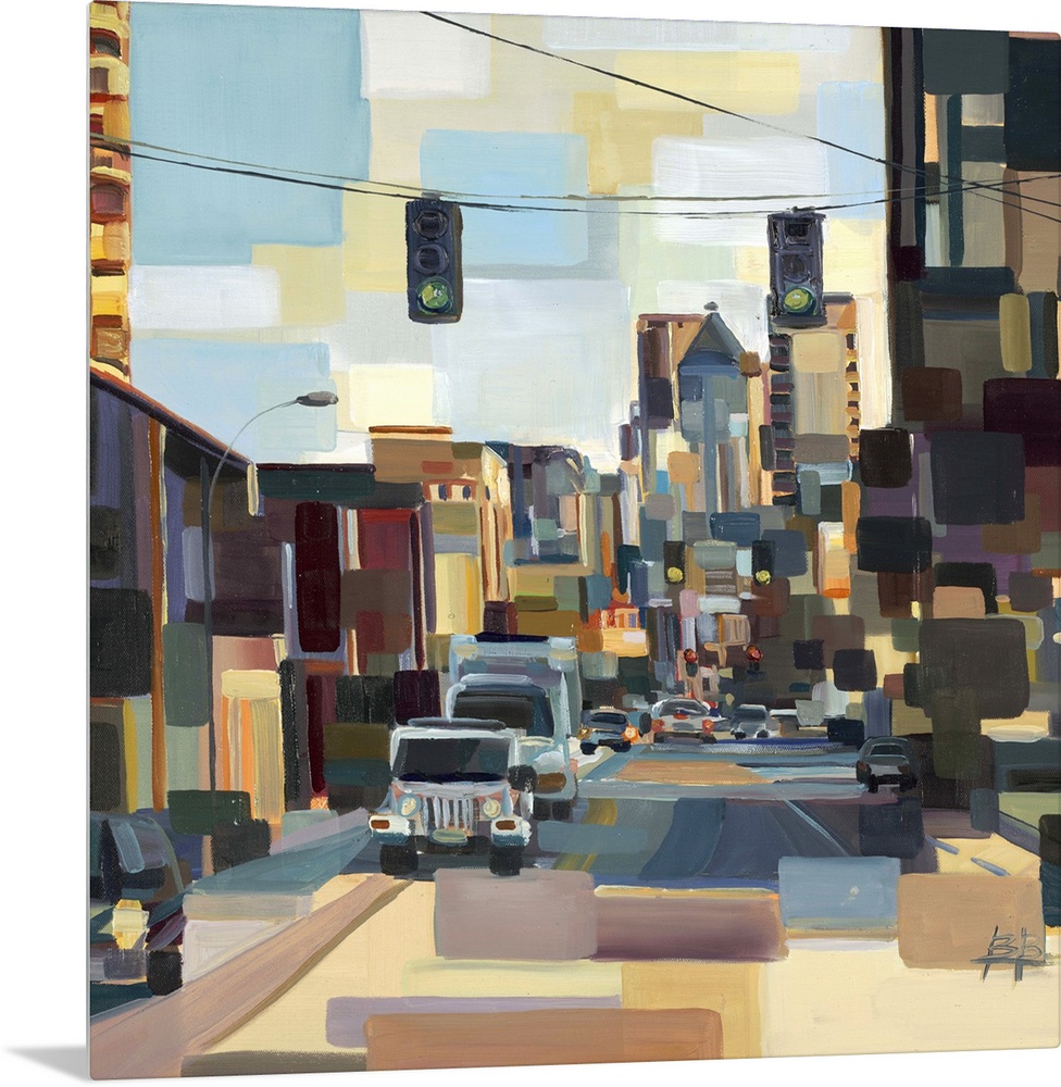<p>Contemporary abstract painting of an urban environment deconstructed into geometric shapes.</p>