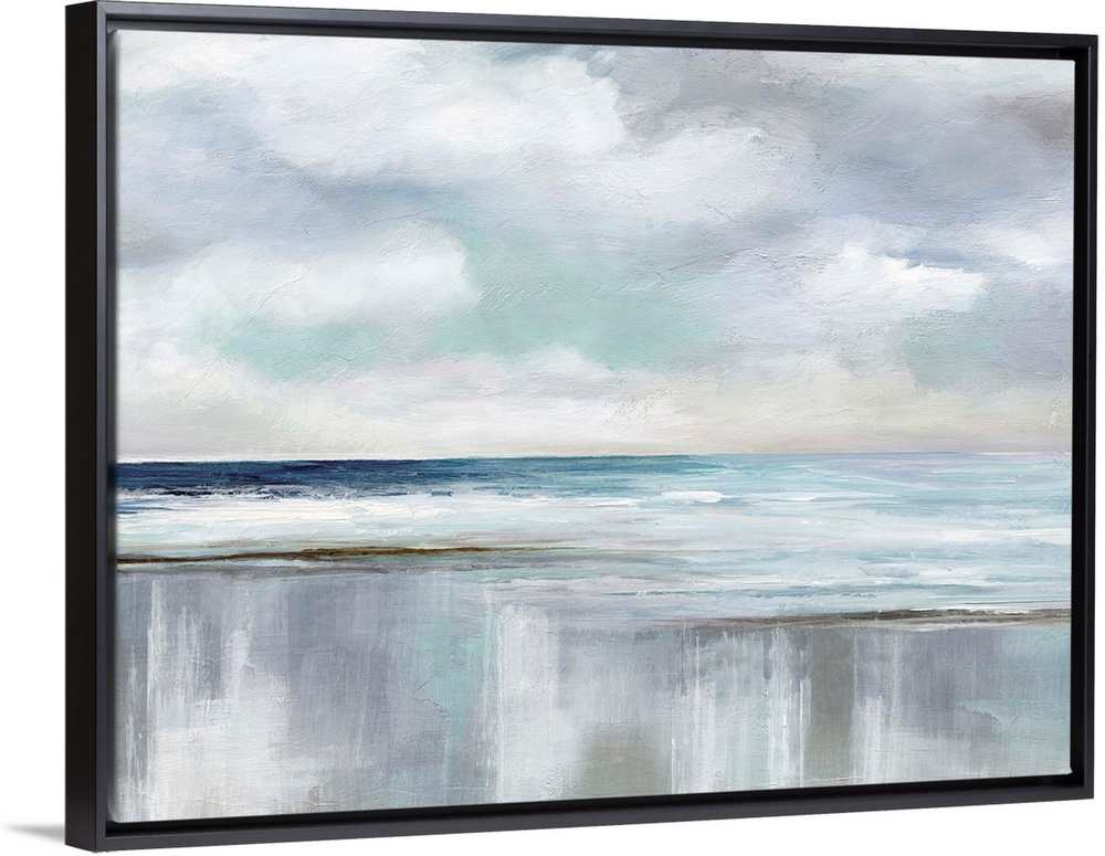 <p>Abstract landscape painting of an ocean with fluffy clouds in the sky using various blues, grays and white colors.</p>