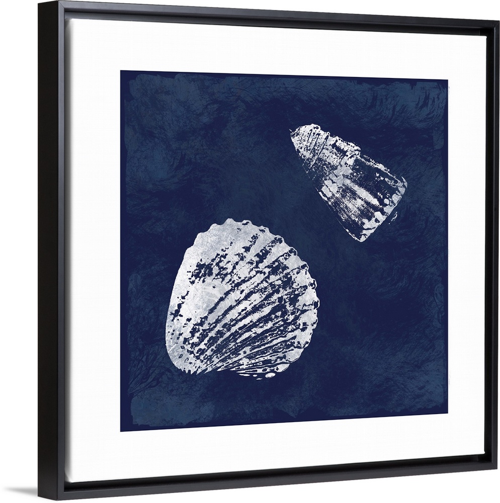 <p>Square cyanotype of white silhouetted seashells on an indigo background with a white boarder.</p>