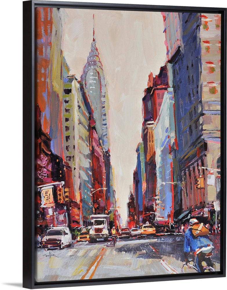 <p>Contemporary painting of a person riding a bicycle through the city.</p>