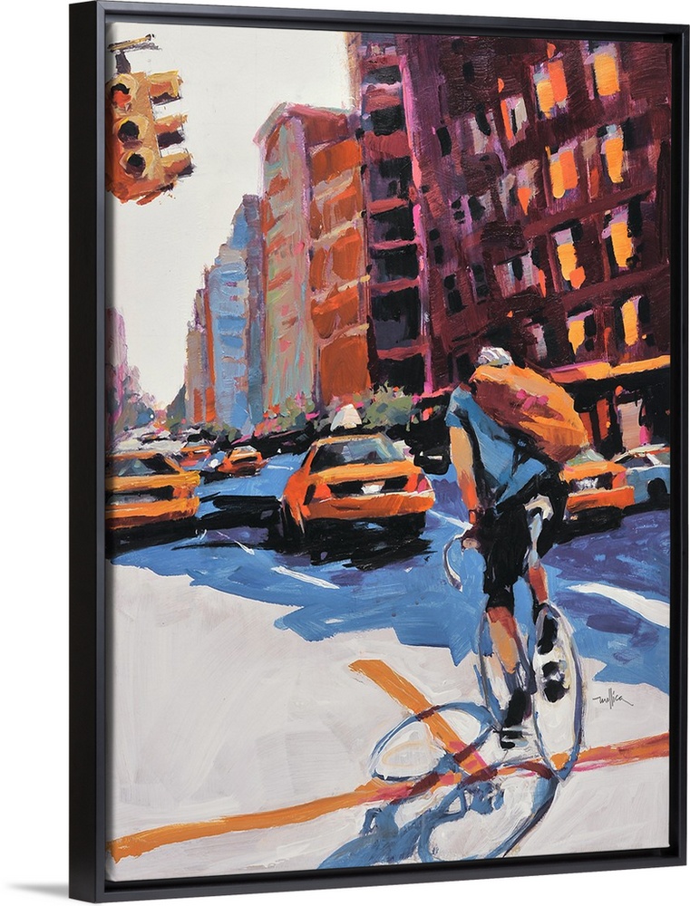 <p>Contemporary painting of a person riding a bicycle through the city.</p>