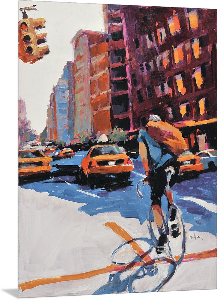 <p>Contemporary painting of a person riding a bicycle through the city.</p>