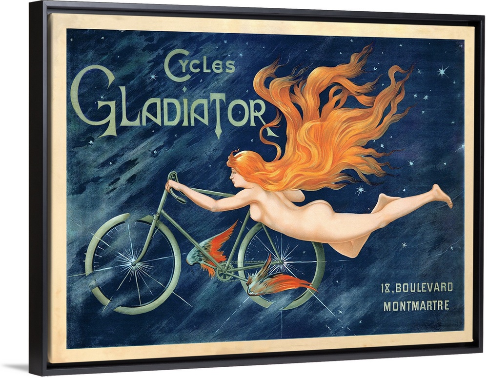 <p>Vintage wall art advertisement for Cycles Gladiator of a nude woman with long flowing hair, holding onto a bicycle.</p>