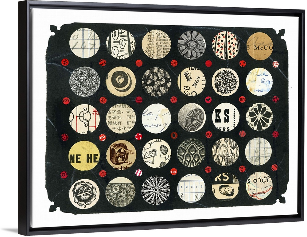 <p>Mixed media abstract artwork featuring a collection of circular elements.</p>