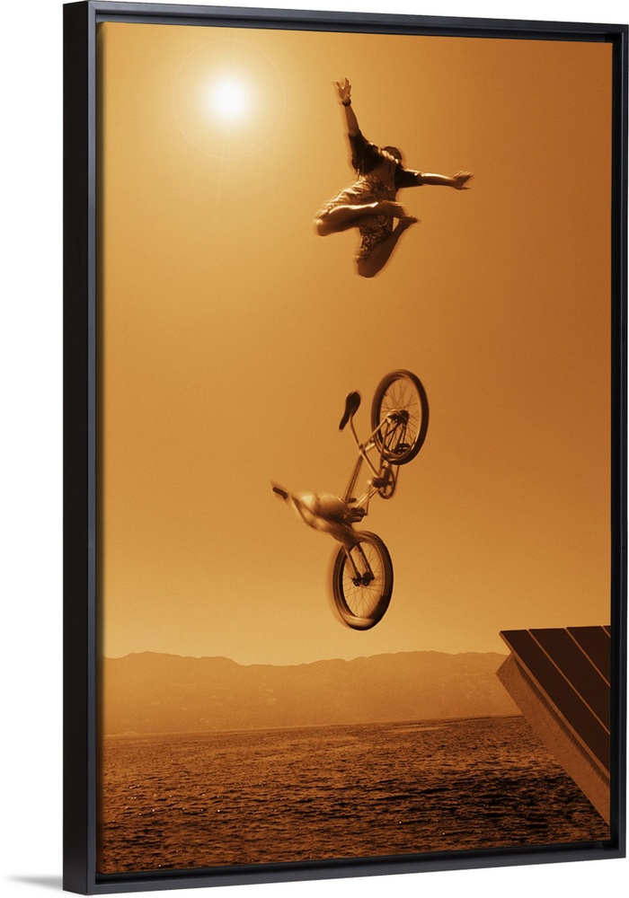<p>Cyclist going off jump into water in brown tones</p>