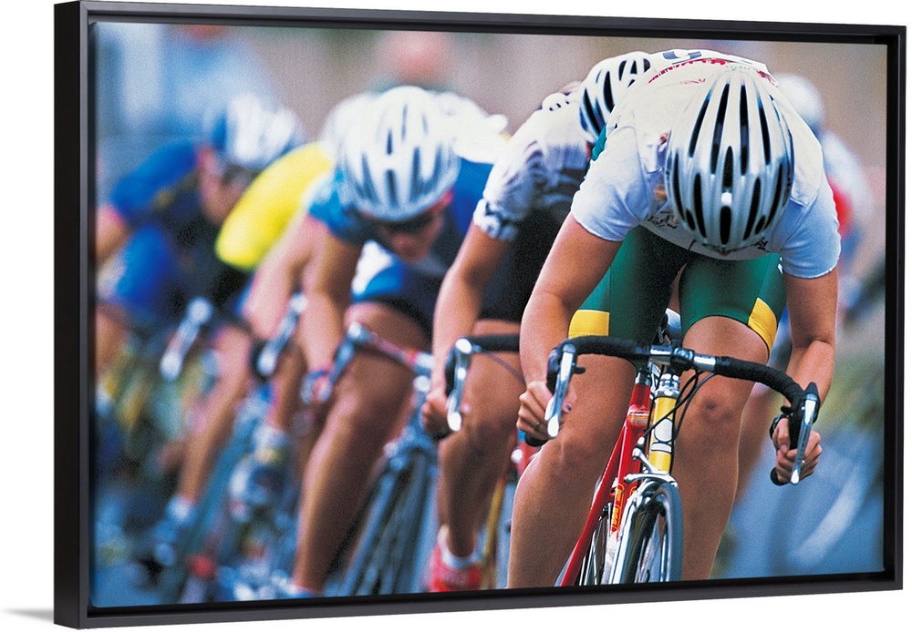 <p>Photograph of a several racers in a bicycle race hurrying towards the finish line, with their heads down, pedaling hard.</p>