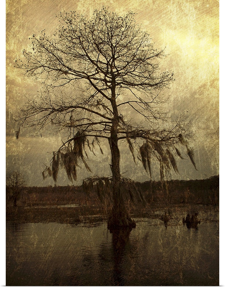 <p>A lone cypress, its branches hanging with moss, stands against a golden sky in a Louisiana swamp.</p>