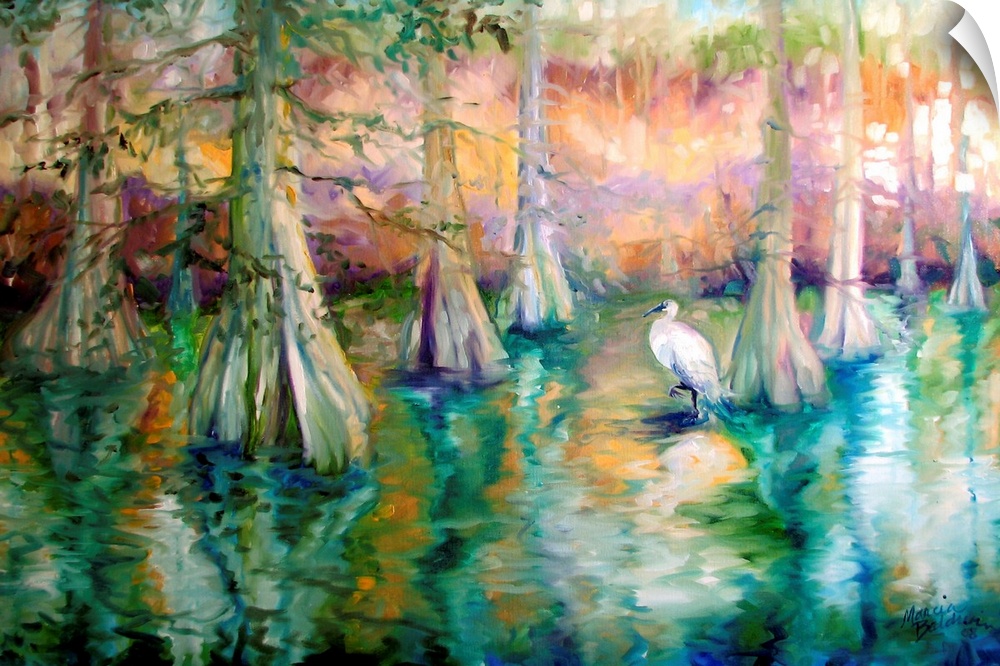 <p>Contemporary landscape painting of a scene from the Louisiana bayous with a white heron and cypress trees in a swamp with a warm, colorful sky in the background.</p>