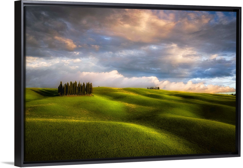 <p>Italy, Tuscany, Val d'Orcia. Cypress grove and clouds at sunset. Credit: Jim Nilsen</p>