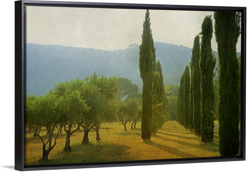 <p>A photograph of an idyllic countryside scene, with late afternoon light hitting cypress trees and creating long shadows.</p>
