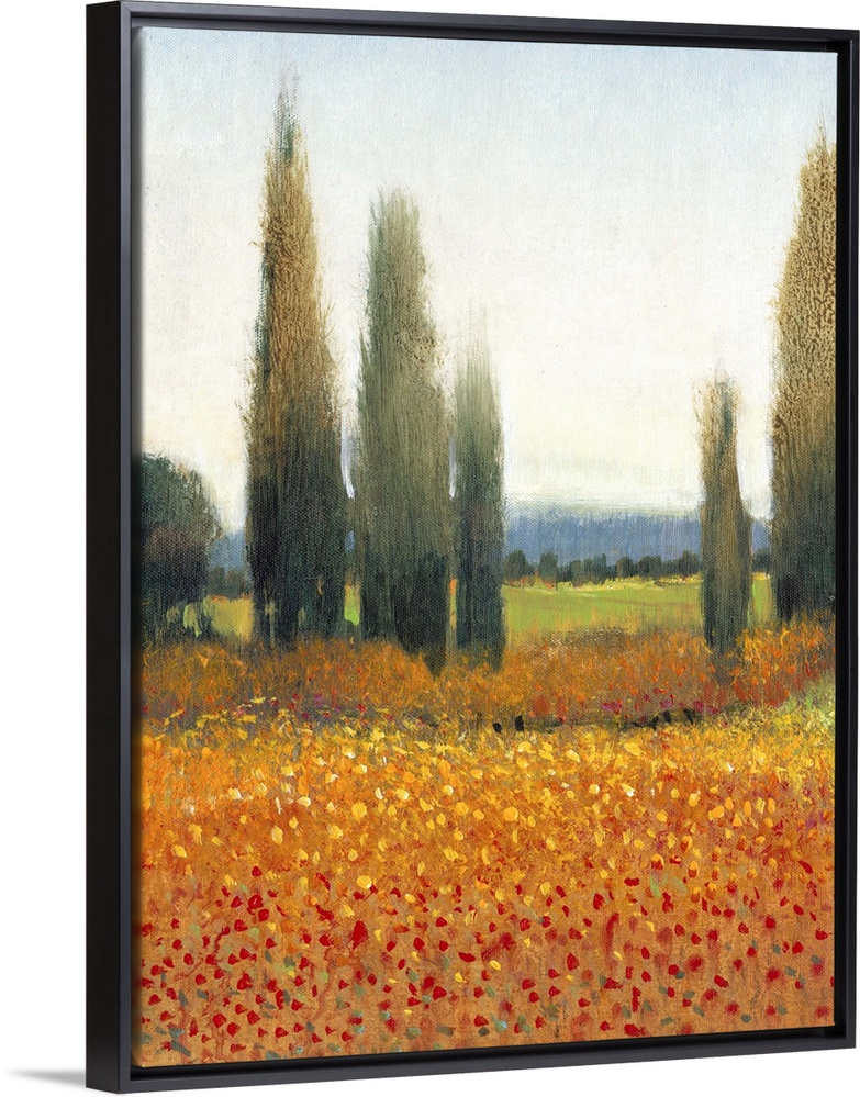 <p>Painting of a row of cypress trees in the Italian countryside.</p>