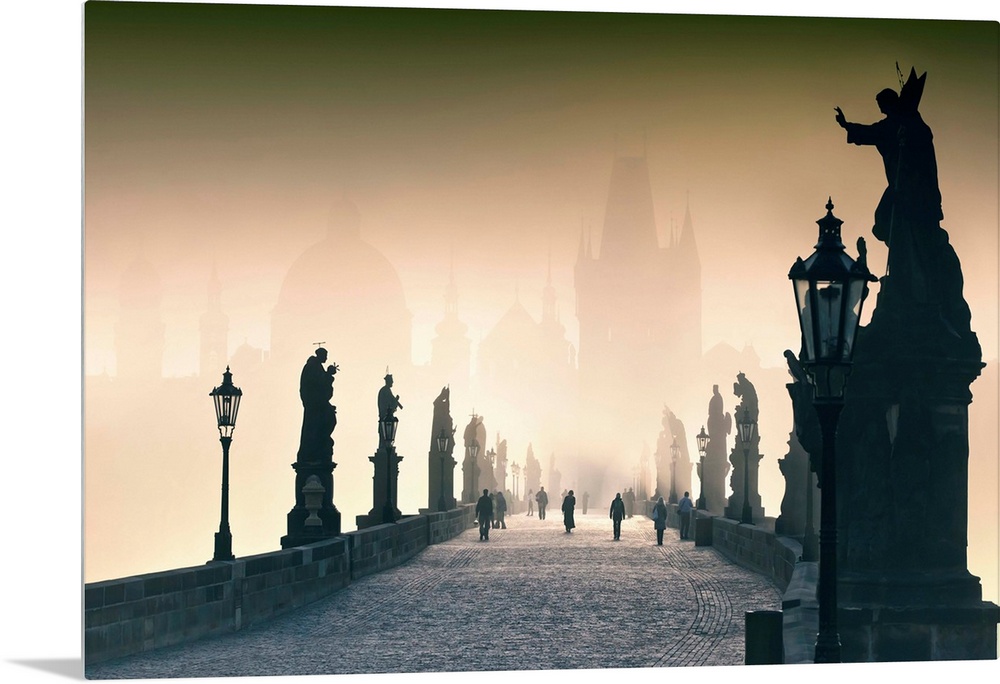 <p>Czech Rep, Prague, Charles Bridge, People walking on Charles bridge on a foggy morning.</p>