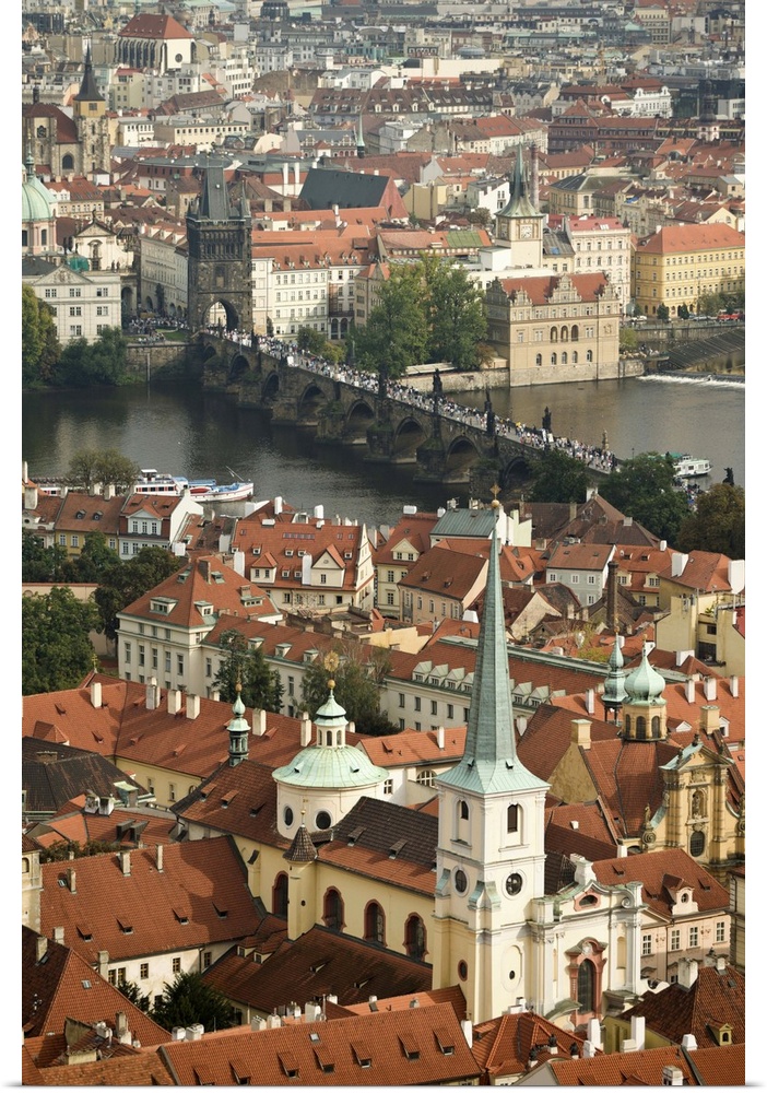 <p>CZECH REPUBLIC, Prague. View of Prague and the Charles Bridge from the Bell Tower, St. Vitus Cathedral.</p>