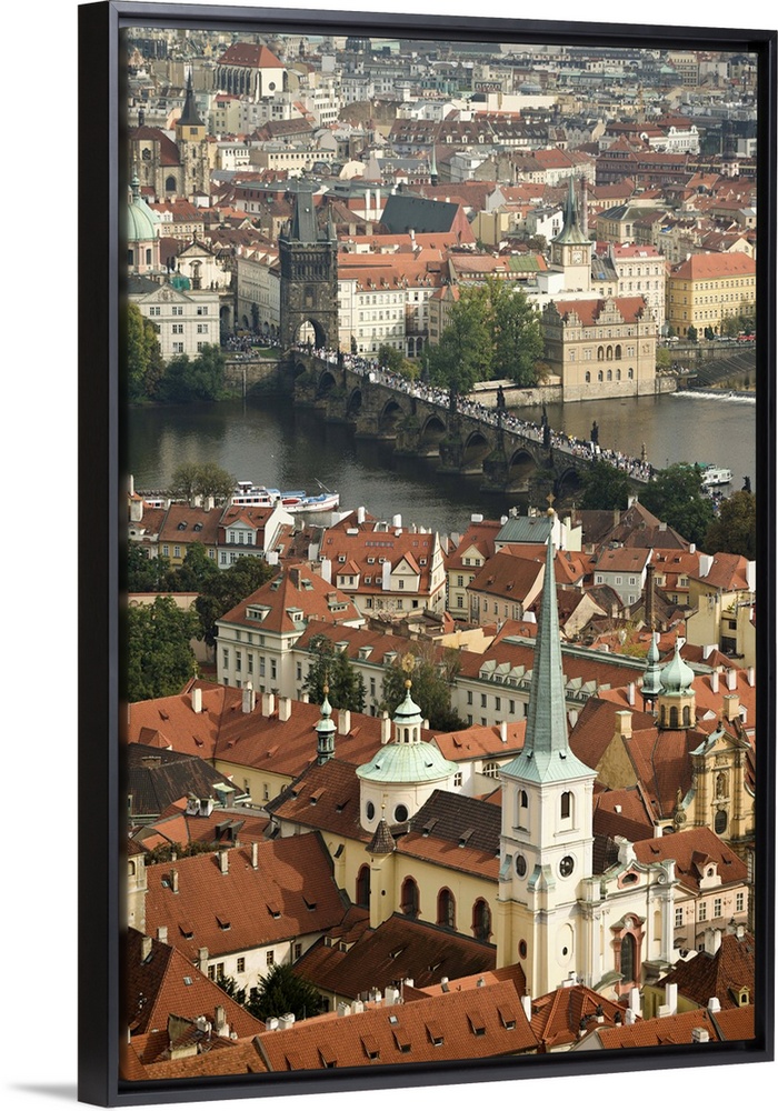 <p>CZECH REPUBLIC, Prague. View of Prague and the Charles Bridge from the Bell Tower, St. Vitus Cathedral.</p>