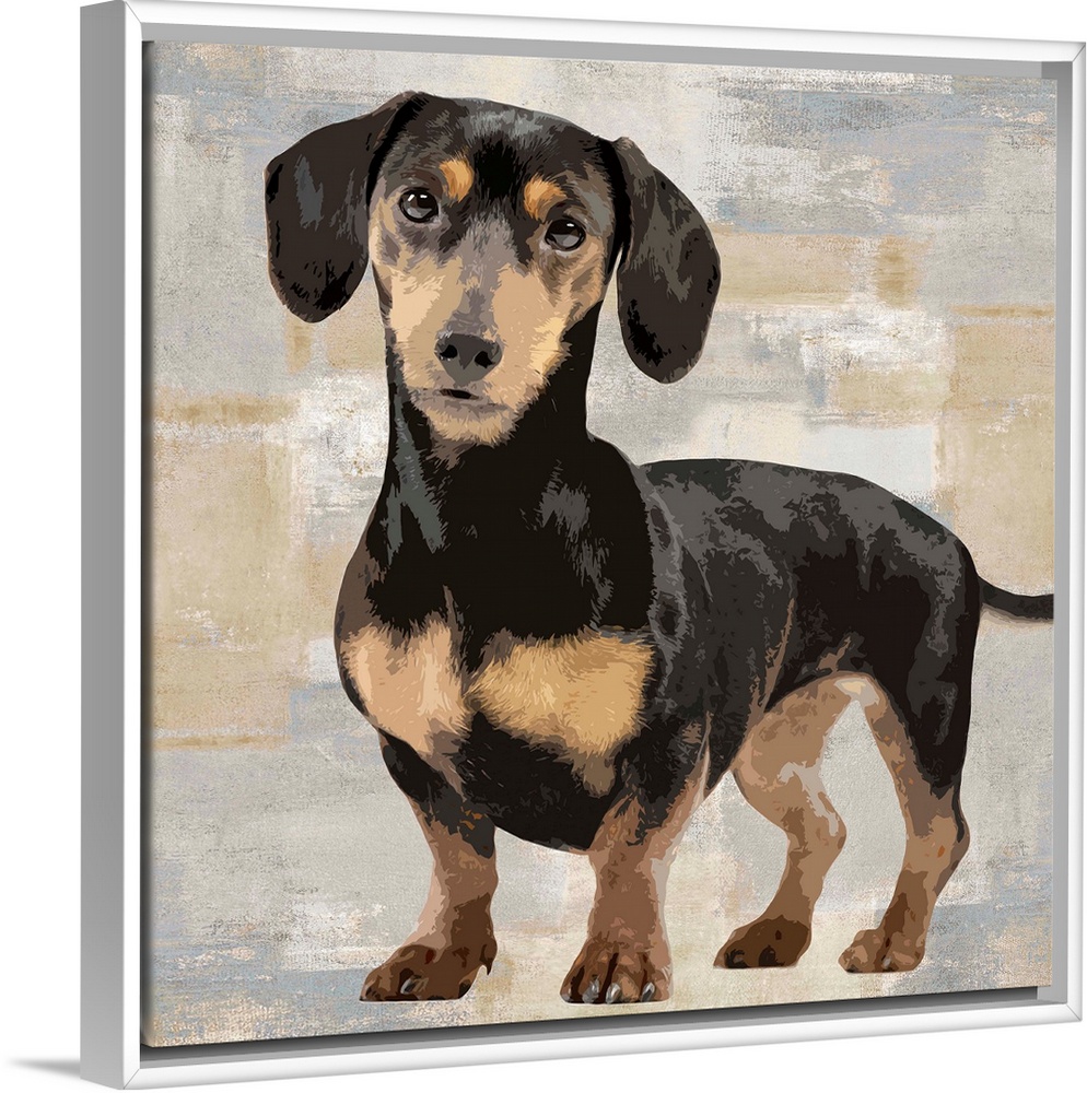 <p>Square decor with a portrait of a Dachshund on a layered gray, blue, and tan background.</p>