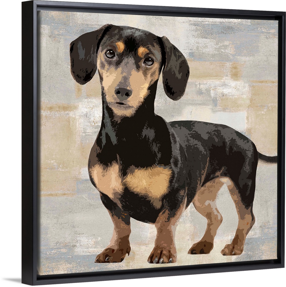 <p>Square decor with a portrait of a Dachshund on a layered gray, blue, and tan background.</p>