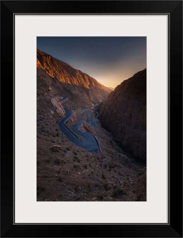 <p>Hairpin curves along Dades Gorge in Morocco during golden hour before sunset.</p>