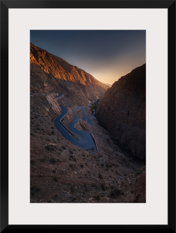 <p>Hairpin curves along Dades Gorge in Morocco during golden hour before sunset.</p>