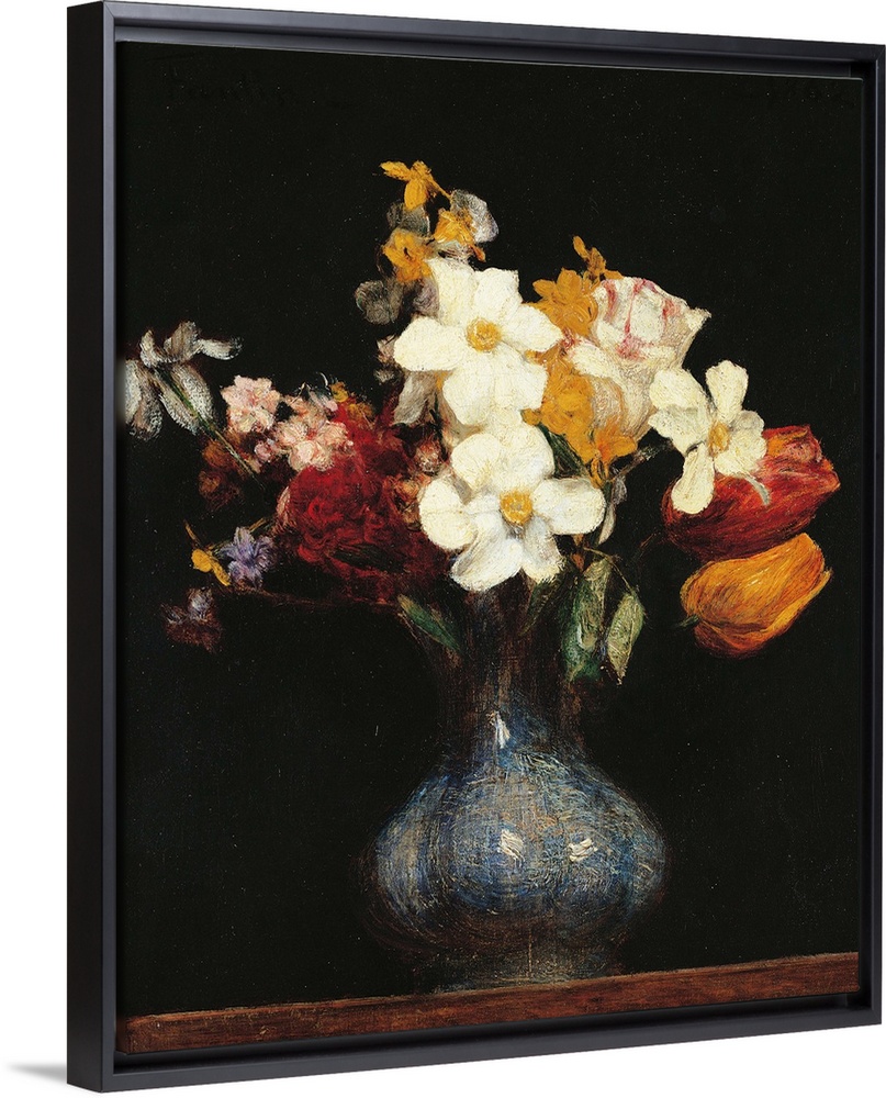 <p>Daffodils and Tulips, by Henri Fantin-Latour, 1862, 19th Century, oil on canvas, cm 46 x 38,5 - France, Ile de France, Paris, Muse dOrsay. All. Daffodil tulip vase blue orange red yellow white green petal leaf flowers table pink bunch. (251220) Everett Co</p>