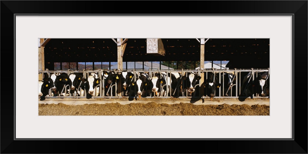 <p>Panoramic photograph taken of dairy cattle as their heads stick out of the milking parlor.</p>