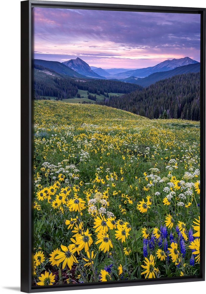<p>Landscape photograph with a field of wildflowers and mountains in the distance at sunset.</p>