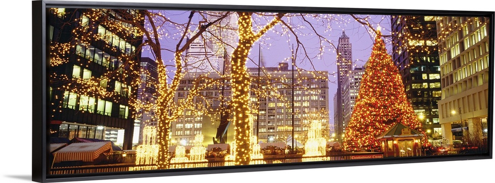 <p>Panoramic photograph of Daley Plaza decked out with Christmas lights in the trees and a large Christmas tree sitting by the fountains.</p>