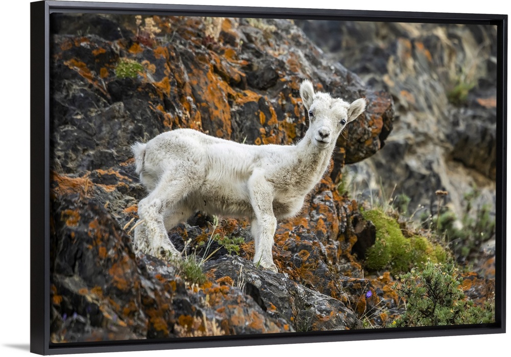 <p>Dall sheep lamb (Ovis dalli) stands looking at the camera in the rocky Windy Point area of the Chugach Mountains, South of Anchorage; Alaska, United States of America</p>