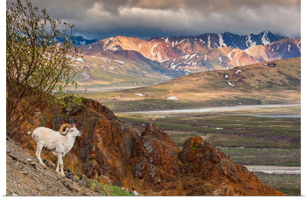 <p>Adult ram Dall Sheep on a hillside overlooking Polychrome Pass and the Alaska Range, Denali National Park.</p>